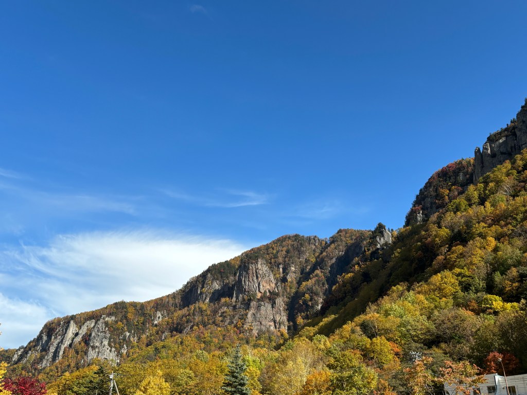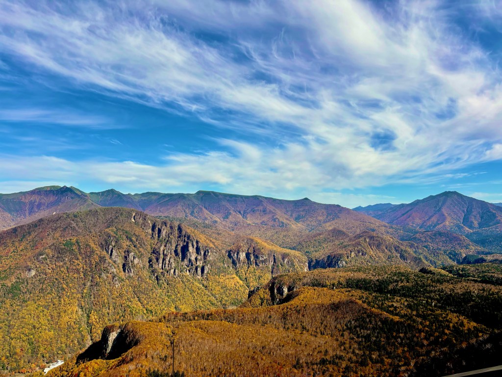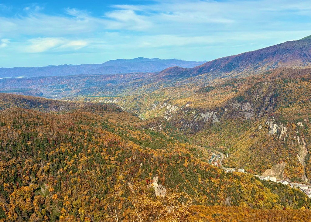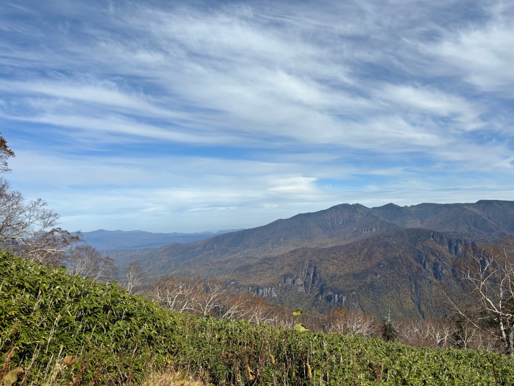 見渡す限り森と山が延々と広がっていて、麓に温泉街は見えるけれども、遠くを探しても一切の人里が見当たらない。白馬で山に登った時とはまた違う光景だなと思った。白馬はとにかく山々が急峻で、近くて、高くて、視界を遮ってくる。目の前の山を越えたら何が広がっているのか想像させられる。